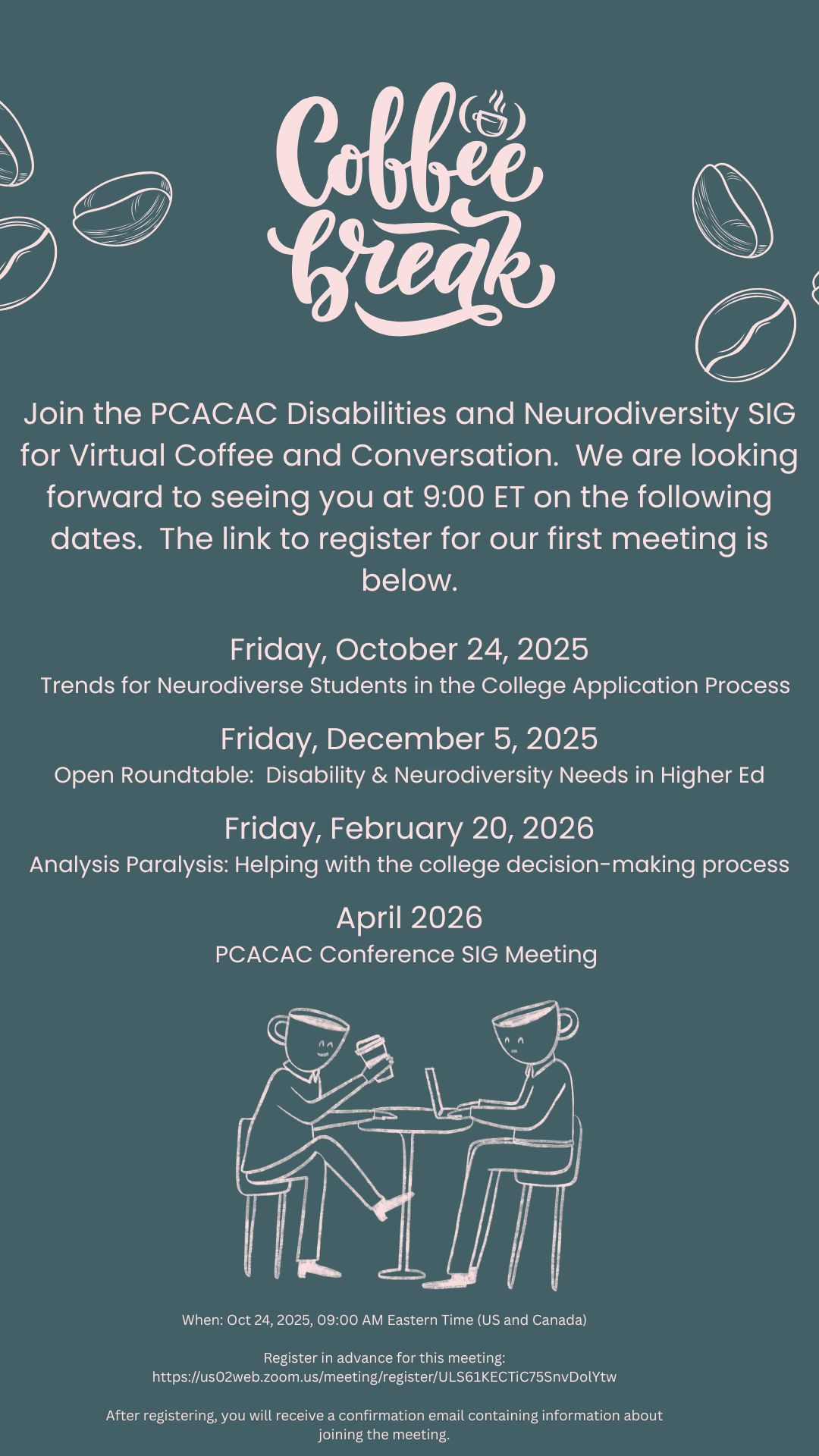 Join the PCACAC Disabilities and Neurodiversity SIG for virtual coffee and conversation. We look forward to seeing you at 9:00 am (ET) on
