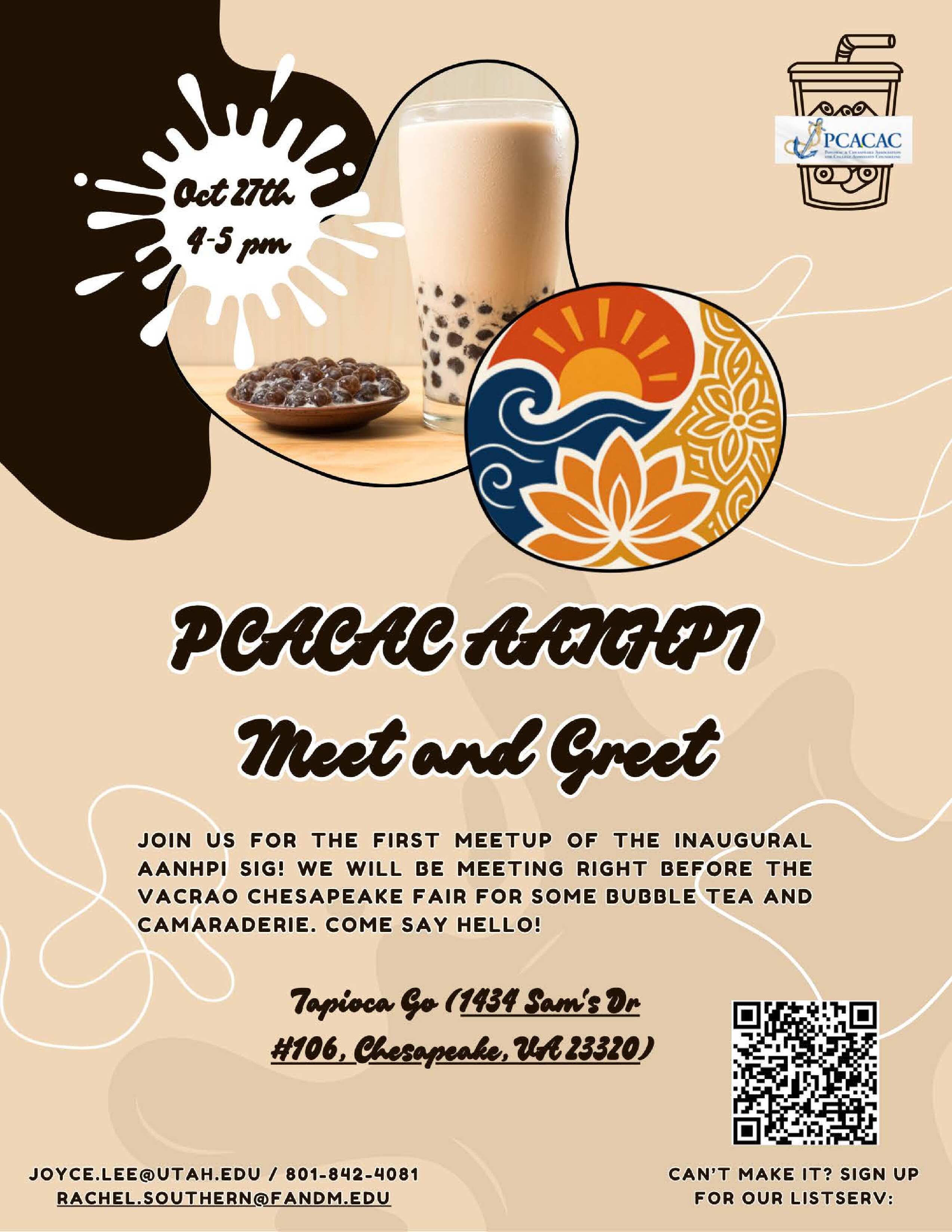 Join us for the first meetup of the inaugural Asian American, Native Hawaiian, Pacific Islander SIG! We will meet right before the VACRAO Chesapeake College Fair for bubble tea and camaraderie. Come say hello! October 27